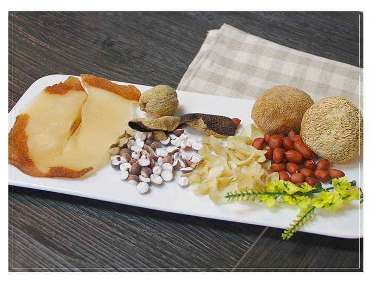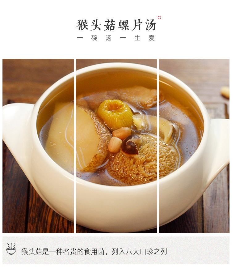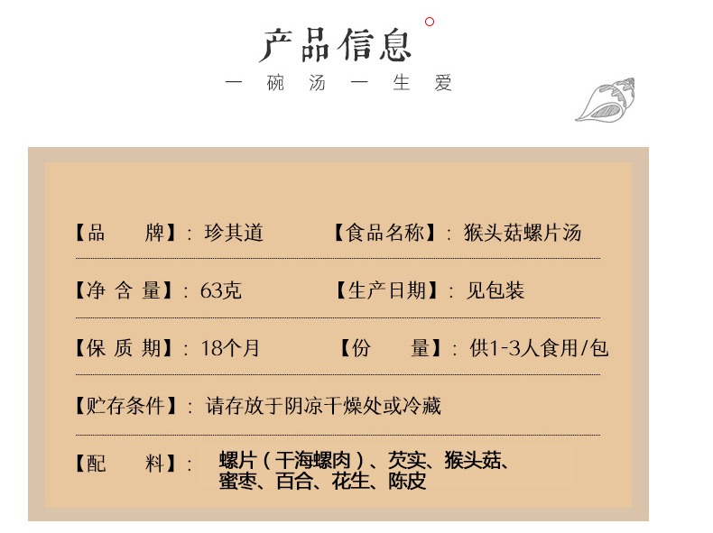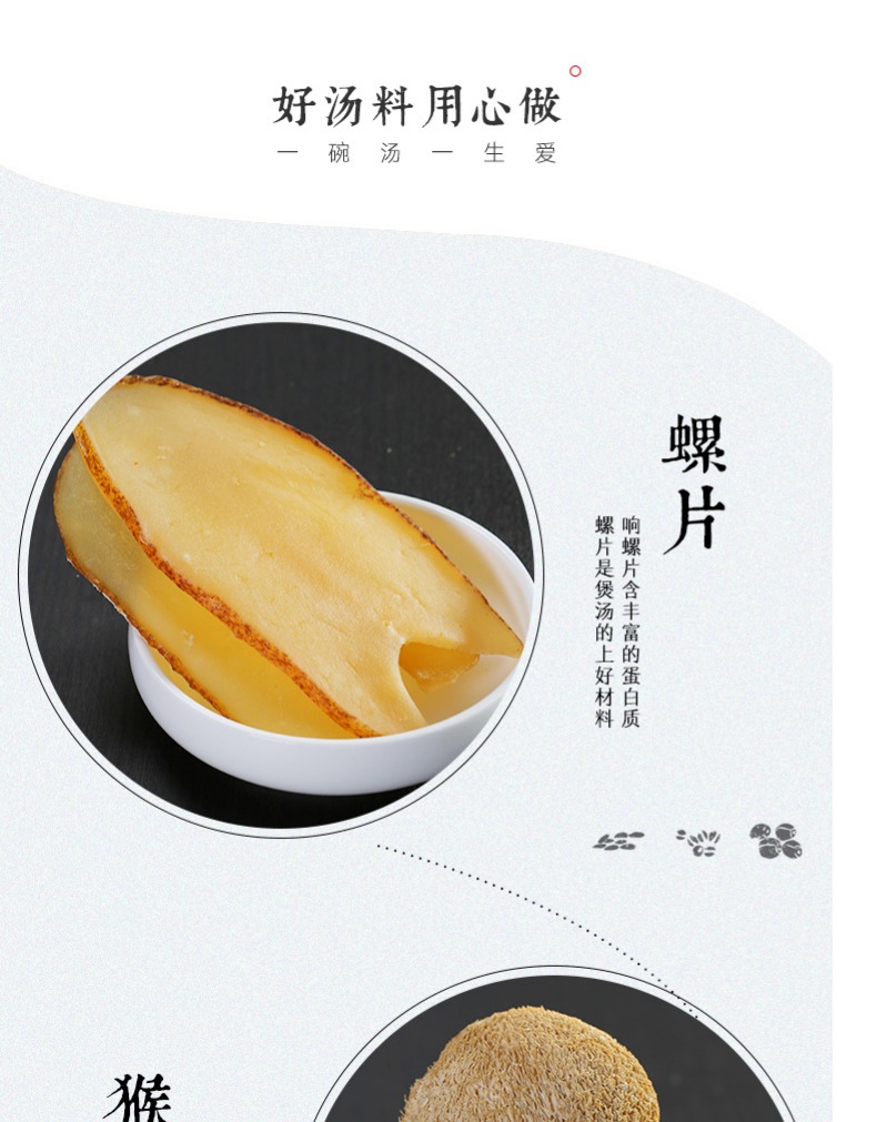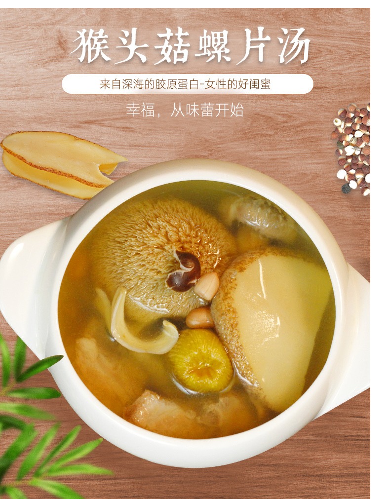 • 配料:螺片(干海螺肉)、芡實(shí)、猴頭菇、蜜棗、百合、花生、陳皮